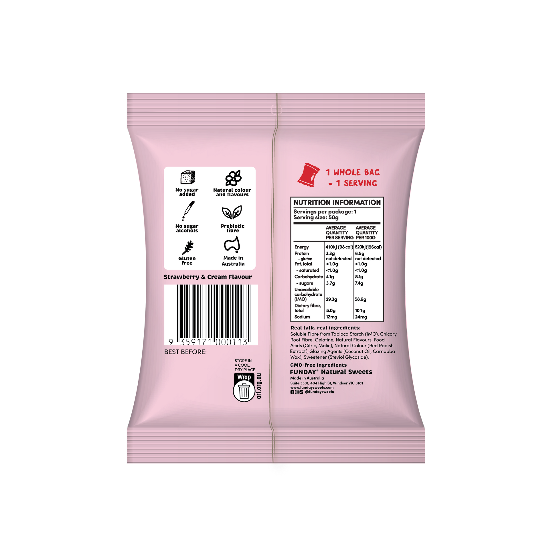 Treat your tastebuds to this classic duo - juicy strawberry and rich creamy flavours. Not only are they bursting with flavour, but they're also super soft – like biting into a fruity cloud. Seriously, your taste buds are in for a melt-in-your-mouth treat! Enjoy natural and nourishing ingredients, with no sugar-added, no sugar alcohols (No sugar alcohols = No nasty laxative effect) and a delicious dose of prebiotic fibre.